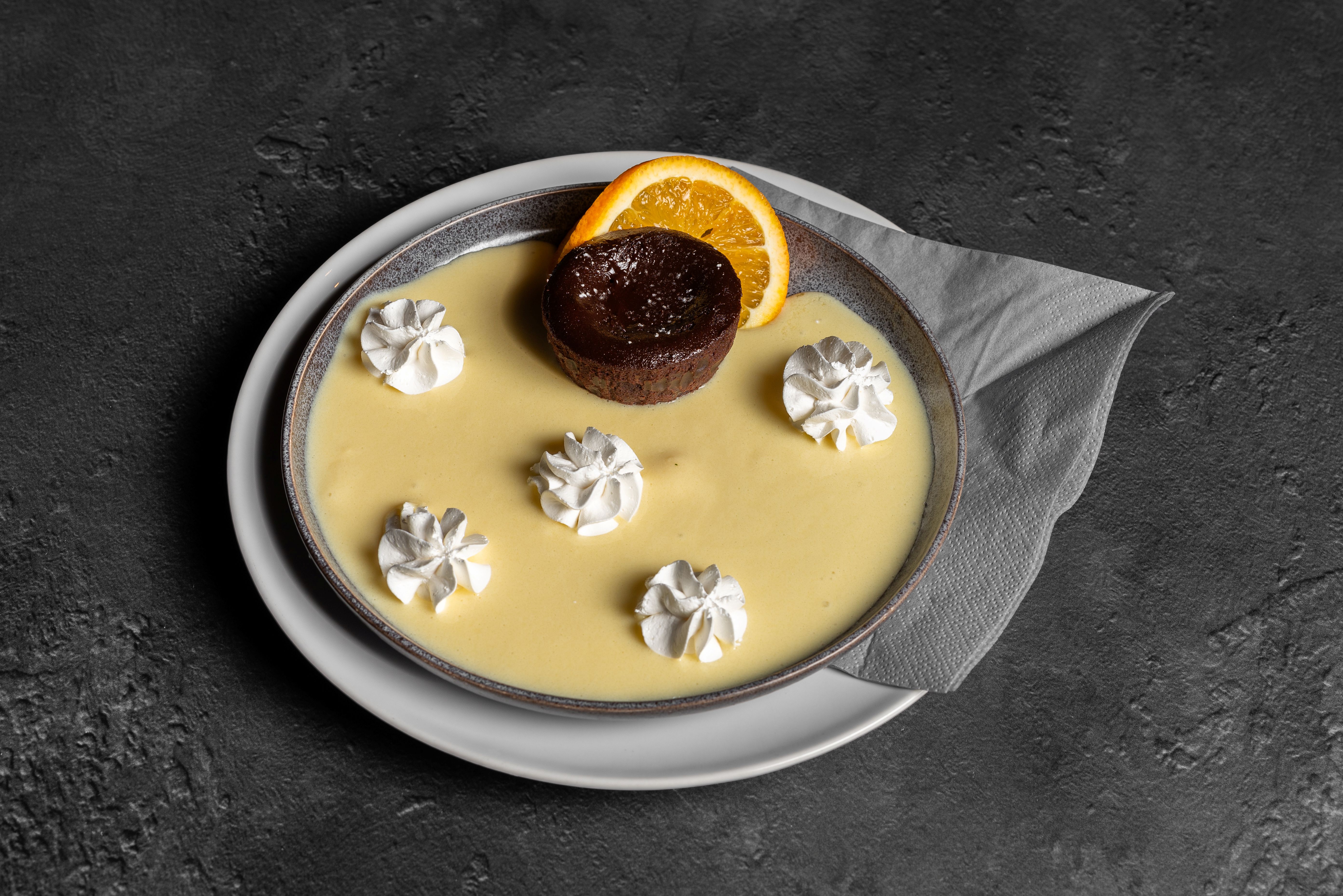 Csokoládé szuflé, vanilíaöntettel, tejszínhabbal |